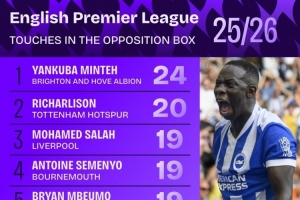 英超对方禁区触球榜:明特24次居首,理查利森次席&萨拉赫第三