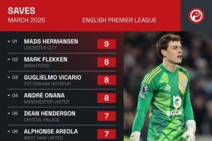 体育资讯4月1日讯 Squawka统计了3月份英超门将的扑救次数,并列出榜单,赫尔曼森9次居首,弗莱肯、维卡里奥、奥纳纳8次并列第二。