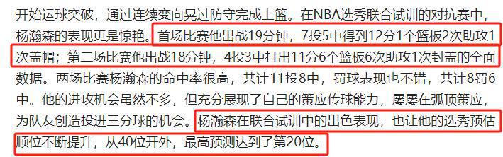 在坚持不懈的努力下,杨瀚森的选秀预估顺位不断的提升,从最初的末流一跃来到了20多位,这也与最新试训的篮网队的签位重合。
