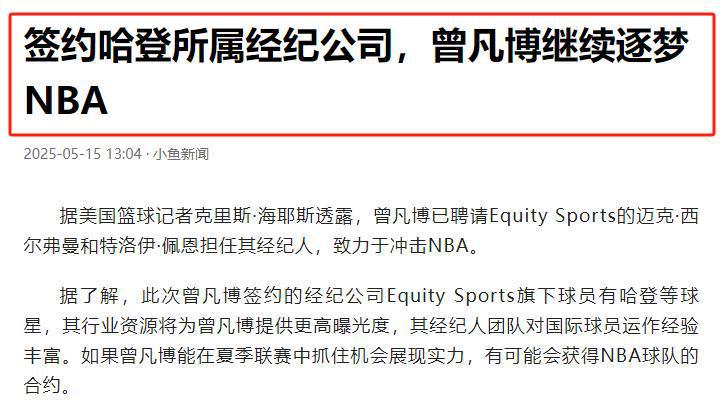 据篮球名记透露,曾凡博签约了与哈登同一家经纪公司,这家公司能够带来的曝光度很高,相信能够为曾凡博寻求更多的试训机会,帮助他实现梦想。