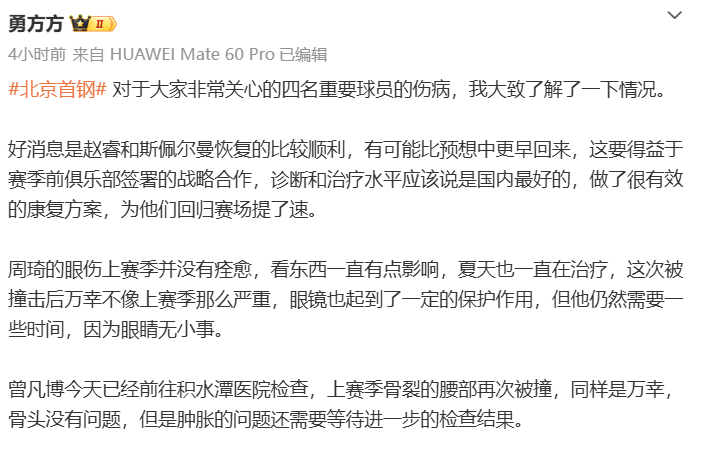 随后北京队记者勇方方更新报道,进一步说明了这4位球员的伤病情况,好消息是赵睿和斯佩尔曼恢复的比较顺利,有可能比预想中更早回来;周琦的眼伤上赛季并没有痊愈,看东西一直有点影响,夏天也一直在治疗,这次被撞击后万幸不像上赛季那么严重,眼镜也起到了一定的保护作用,但他仍然需要一些时间,因为眼睛无小事。